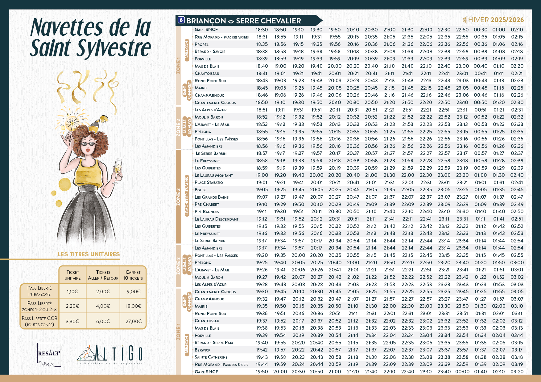 | BRIANCON - Forville | 06:34 | 06:30 | 07:24 | 07:24 | 07:39 | 07:39 | 07:59 | 08:19 | 08:29 | 08:39 | 08:59 | 09:09 | 09:19 | 09:29 | 09:39 | 09:49 | 09:59 | 10:19 | 10:29 | 10:39 | 10:49 | 10:59 | 11:09 | 11:19 | 11:39 | 11:49 | 11:59 | 12:09 | 12:19 | 12:29 | 12:39 | 12:59 | 13:09 | 13:19 | 13:39 | 13:49 | 13:59 | 14:19 | 14:29 | 14:39 | 14:49 | 14:59 | 15:09 | 15:19 | 15:39 | 15:49 | 15:59 | 16:09 | 16:19 | 16:29 | 16:39 | 16:59 | 17:09 | 17:19 | 17:29 | 17:39 | 17:49 | 17:59 | 18:19 | 18:29 | 18:39 | 18:59 | 19:19 | 19:39 | 20:19 | 21:39 | 22:59 |